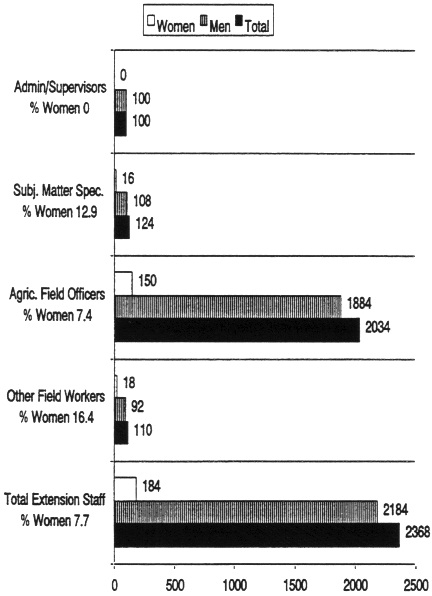 Extension services and agricultural training. The Extension Services Department did not focus on gender issues until 1990, when it became apparent that agricultural extension was contacting only 44% of women farmers. In 1994 the Department began focusing on the constraints to women's participation in extension in an attempt to develop a more appropriate package to reach women farmers.