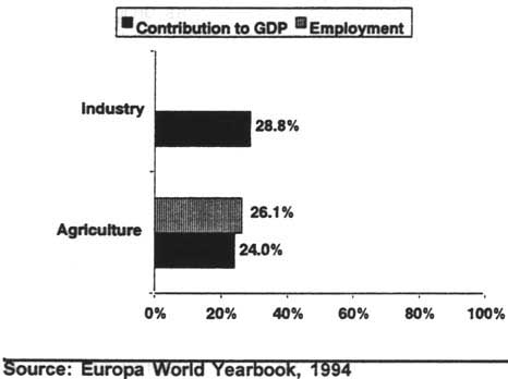 Agriculture plays a significant role in the economy of Iran. From 1989 to 1994, agriculture accounted for an average of 27.8% of the GDP, and employed 26.1 % of the labour force in 1992. The principal cash crops are fresh and dried fruit. Agricultural produce accounted for 47% of non-oil exports in 1989. The main subsistence crops are wheat, barley, sugar beet and sugar cane. Mutton, lamb and poultry are also important for domestic food supply.