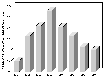 Dentro del marco del programa TG-HDP, se han desarrollado las pr cticas de conservación del suelo y el agua y se han hecho llegar a los agricultores a partir de 1987, para reducir la erosión a niveles aceptables, permitiendo así un cultivo m s permanente (Salzer, 1987). Las pr cticas consistieron en crear zonas protectoras siguiendo las curvas de nivel, alternando las gramíneas (Bracharia ruziensis) y, posteriormente, franjas de plantas de hoja perenne (setos de leucaena y de guandú), plantando los cultivos en paralelo a las curvas de nivel. Durante los primeros cuatro años de la ejecución del proyecto (en los cuales se facilitaron incentivos a los agricultores y a los extensionistas), el número de agricultores que adoptaron las tecnologías promocionadas aumentó a ritmo continuo, si bien cuando se terminó el plan general de incentivos en 1991, se produjo una disminución inmediata y constante del interés en las técnicas de conservación del suelo y el agua (véase Figura). Muchos de los agricultores entrevistados por uno de los autores en 1990/91, y después otra vez en 1994/95, manifestaron su desilusión con las prácticas recomendadas para la conservación del suelo y el agua (Enters, 1995).