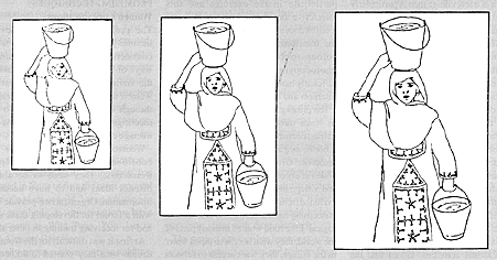 L'autre outil d'évaluation qui a été adapté aux besoins des villageoises est le "calendrier des activités quotidiennes". Cet outil a servi à alimenter les débats sur la routine quotidienne des femmes et leurs activités saisonnières. Comme la réclusion des femmes dans l'enceinte de la famille est un signe de prospérité économique, les femmes n'aiment guère parler de leurs activités extérieures à la maison. Les villageoises avaient du mal à énumérer toutes leurs tâches, et les chefs de groupe ont eu l'idée d'illustrer par des dessins en couleurs ce que les paysannes brahouis peuvent faire pendant la journée. De fait, les femmes ont parlé plus aisément de leurs tâches quotidiennes devant ces images. Si les femmes évoquaient d'autres activités qui n'étaient pas représentées, le chef de groupe dessinait de nouvelles images.