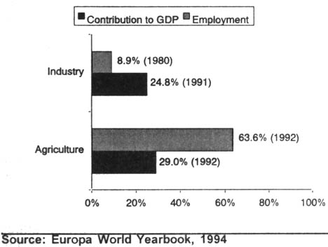 Mauritania's economy is dominated by agriculture, particularly the strong agro-pastoral sector. In 1992, agriculture accounted for 29% of the GDP and 63.6% of the labour force. Output of staple foods such as millet, sorghum, rice, and pulses is insufficient for the country's needs. A large part of Mauritania consists of arid/semi-arid land and is thus unsuitable for crop cultivation. Livestock rearing, however, plays an important role in the lives of rural people. Nomads comprised 12% of the population in 1988, compared to 73% in 1965. Fishing provides approximately 46% of the export earnings and contributes 5-10% of the annual GDP, as well as makes a significant contribution to. domestic food requirements. Fish processing is the most important activity in the manufacturing sector and accounts for as much as 4% of the GDP.