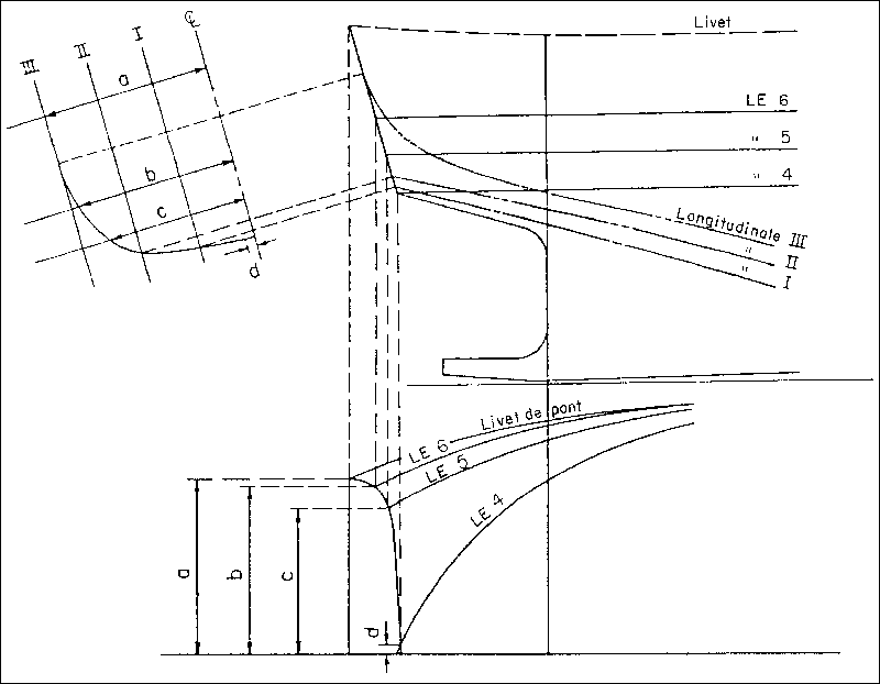 On a relevé une information complémentaire, la perpendiculaire arrière (PP.AR.) en est un exemple. Celle-ci peut aider en donnant des points d'ajustement de la latte dans le prolongement d'une ligne qui se termine, de même qu'elle peut donner un moyen pour vérifier la forme du tableau arrière et l'ajustage des membrures au moment du montage. Une information complémentaire a été incluse pour les mesures du livet de pont et du cambrage qui sont des cotes utiles de vérification au moment de procéder à la construction et particulièrement si on veut utiliser une contrebauquière en ferrociment dans la construction.