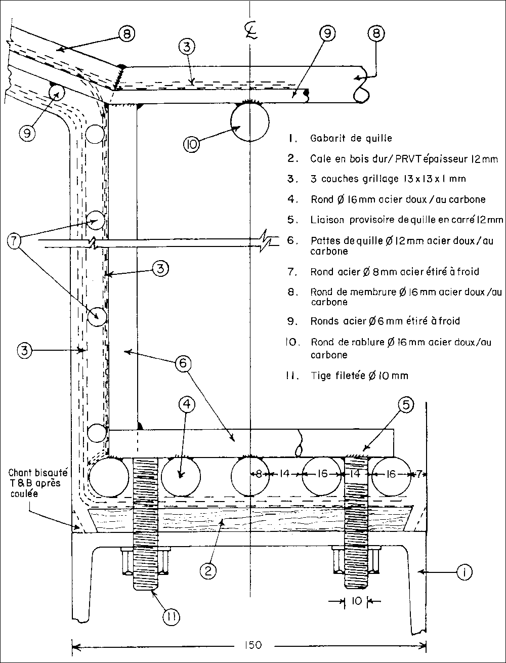 Les liaisons pourront être faites de carrés ou de ronds avec des pattes en tiges filetées de diamètre 10 mm, fixées pour passer entre les deux ronds extérieurs de 16 dans l'armature de la quille et traverser l'âme du gabarit de quille. Ces liaisons doivent être placées près des pattes de quille ou d'armature sans interférer avec elles. Elles devront laisser un espace suffisant pour la pénétration du mortier jusqu'aux éléments qui restent dans leur position pendant la coulée.