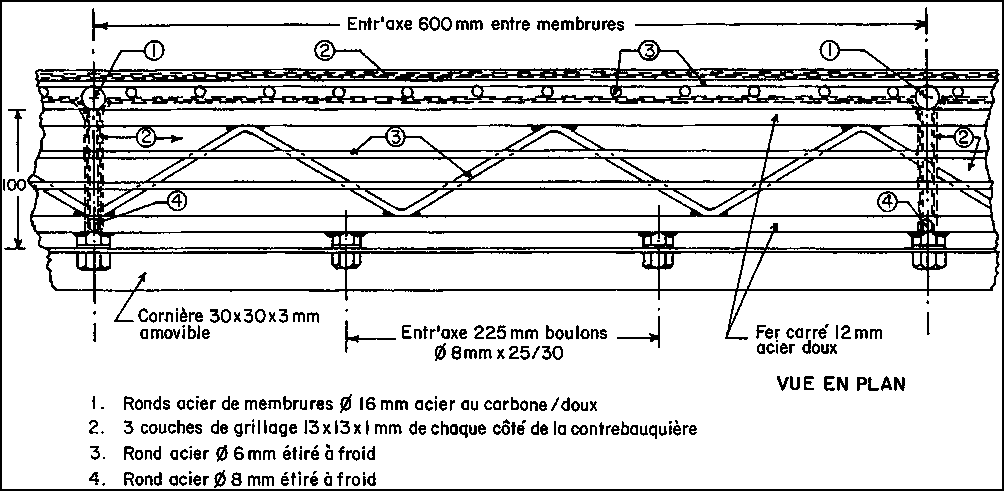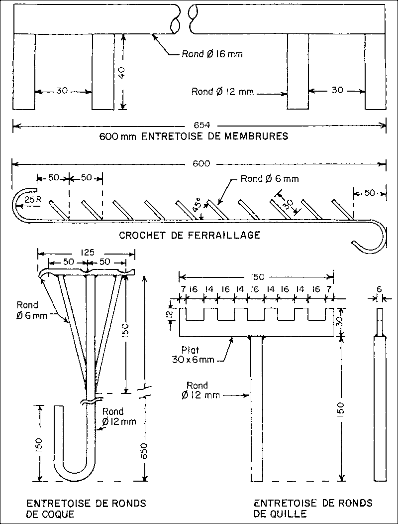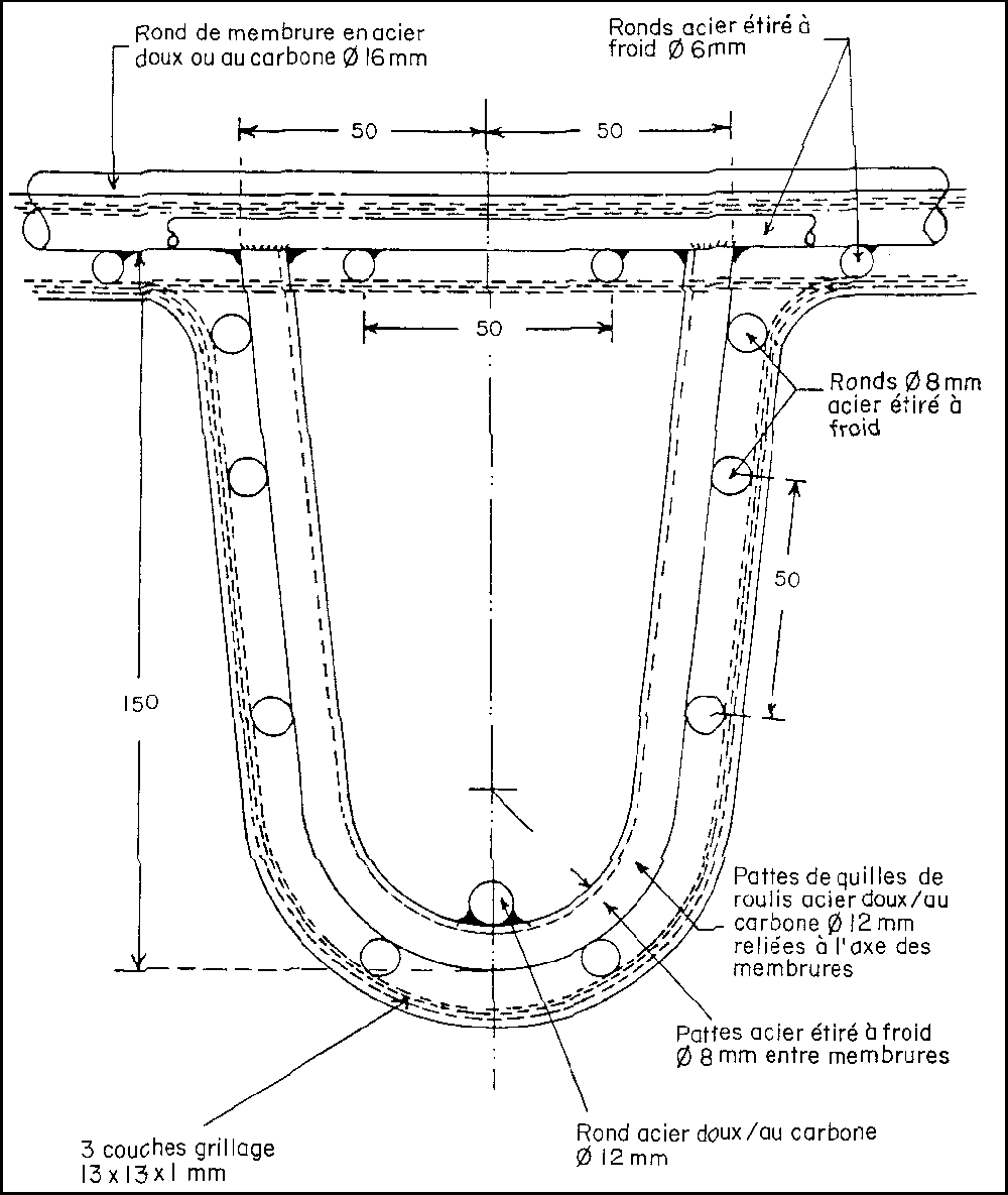 On peut cependant voir, en utilisant les spécifications de la coque et le dessin donnant les détails d'armature (réf Fig. N°10 et dessins N° IND 101 P4 a, b, c), que les varangues et porques doivent avoir une épaisseur finie de 25 mm. Pour créer le chant nécessaire pour les ouvriers et un guide d'épaisseur, on utilise un fer plat réutilisable de 25 × 3 mm sur la face interne de la porque et une cornière de 25 × 25 × 3 mm sur le chant supérieur des varangues. Le fer plat et la cornière sont percés pour recevoir des boulons de 8 mm à tête hexagonale dont les axes sont espacés de 225 mm pour permettre d'enlever les bordures métalliques après la fin de la coulée. Pour créer un évidement pour les écrous sur le bord des membrures, une ou deux (deux sont préférables) rondelles grower de 8 mm seront incorporées. Après enlèvement des boulons et des rondelles, ces évidements seront remplis de résine époxy quand le mortier aura sèché et sera prêt à recevoir les équipements.