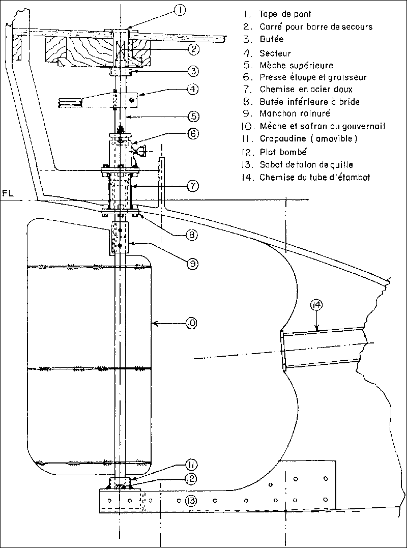 Le sabot du talon de quille peut être déposé et le talon de quille vérifié. Le sabot est réinstallé en utilisant un matériau approprié pour le recevoir. Les brides de la chemise du tube de jaumière sont nettoyées pour être prêtes à l'installation définitive de l'appareil à gouverner.