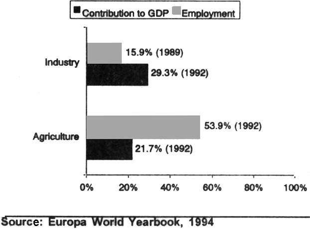 Agriculture plays an important role in the country's economy, accounting for 21.7% of the GDP and employing 53.9% of the labour force in 1992. About 61% of the population live in rural areas. The main cash crops are bananas, which accounted for 35% of export earnings, and coffee, which accounted for 17.6% in 1992. Exports of shellfish, meat and timber are also important. The main subsistence crops are maize, plantains, beans and rice. Agriculture has been adversely affected by fluctuations in the prices of bananas and coffee on the world market. Food security remains a basic pillar of the country's economic policy.