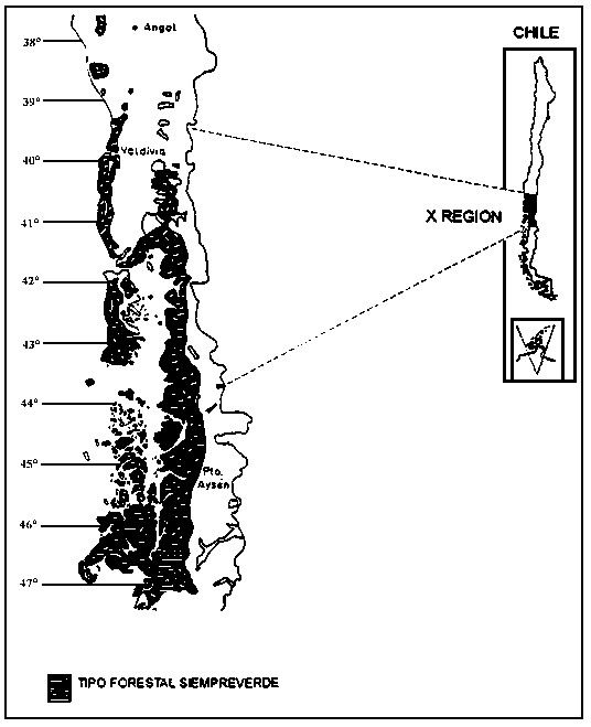 Figura 2.1 Ubicación del bosque del tipo forestal siempreverde en la X Región de Chile. Fuente: Donoso (1989).