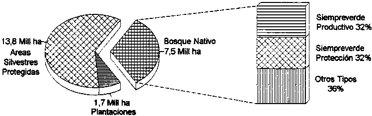 El recurso forestal en Chile alcanza a 23 millones de hectáreas, de las cuales 7,5 son bosques nativos potencialmente productivos, 1,7 corresponden a plantaciones y el resto a áreas silvestres protegidas, figura 2.2 (INFOR et al, s.f.b). De la superficie de bosques nativos se estima que 4,8 millones de hectáreas corresponden al tipo siempreverde (Donoso, 1989) y casi la mitad son bosques de protección (Cabrera, 1992).