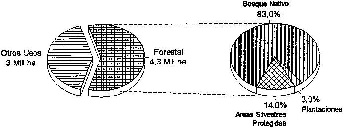 La X Región de Chile con una extensión de 7,3 millones de hectáreas posee una importante parte de este recurso forestal con 4,3 millones de hectáreas, de las cuales un 83% corresponde a bosque nativo potencialmente productivo, 3% a plantaciones y el restante 14% a áreas protegidas, figura 2.3. Dentro del bosque nativo de la X Región, se encuentra la mayor concentración del tipo forestal siempreverde con aproximadamente 1,3 millones de hectáreas (González, 1991).