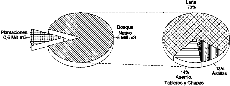 El consumo de madera en trozos de la industria forestal en Chile alcanzó a 18,8 millones de m3 en 1992 más otros 10 millones de m3 por consumo de leña (INFOR et al, s.f.a; CORMA, 1994b). La X Región en 1993 aportó con 5,6 millones de m3, de los cuales 5 millones correspondieron a bosque nativo y sólo 0,6 a plantaciones (INFOR et al, s.f.b). De la cosecha de nativo sólo el 14% estuvo destinado a la industria del aserrío, tableros y chapas, el 13% a la producción de astillas y el restante 73% a leña, figura 2.4.