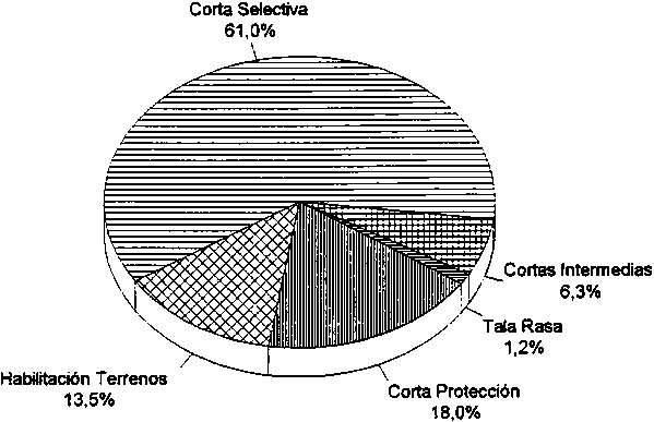 De acuerdo con información de CONAF a 1991, en la X Región un 56% de las cosechas corresponderían al tipo forestal siempreverde y estarían autorizadas a explotarse con plan de manejo aprobado, 52609 hectáreas para el período 90-96, esto es el 3,9 % de la superficie de este tipo forestal (González, 1991). Cabe destacar que esta superficie se reparte en unas 800 unidades prediales, de las cuales el 65% son menores de 50 hectáreas y sólo el 3% son mayores de 500 hectáreas. En base a estadísticas de 1990 se obtuvo que un 61 % de la corta correspondió a corta selectiva, 13,5% habilitación terrenos agrícolas, 18% a corta de protección, 1,2% a tala rasa y el resto a cortas intermedias, figura 2.5.