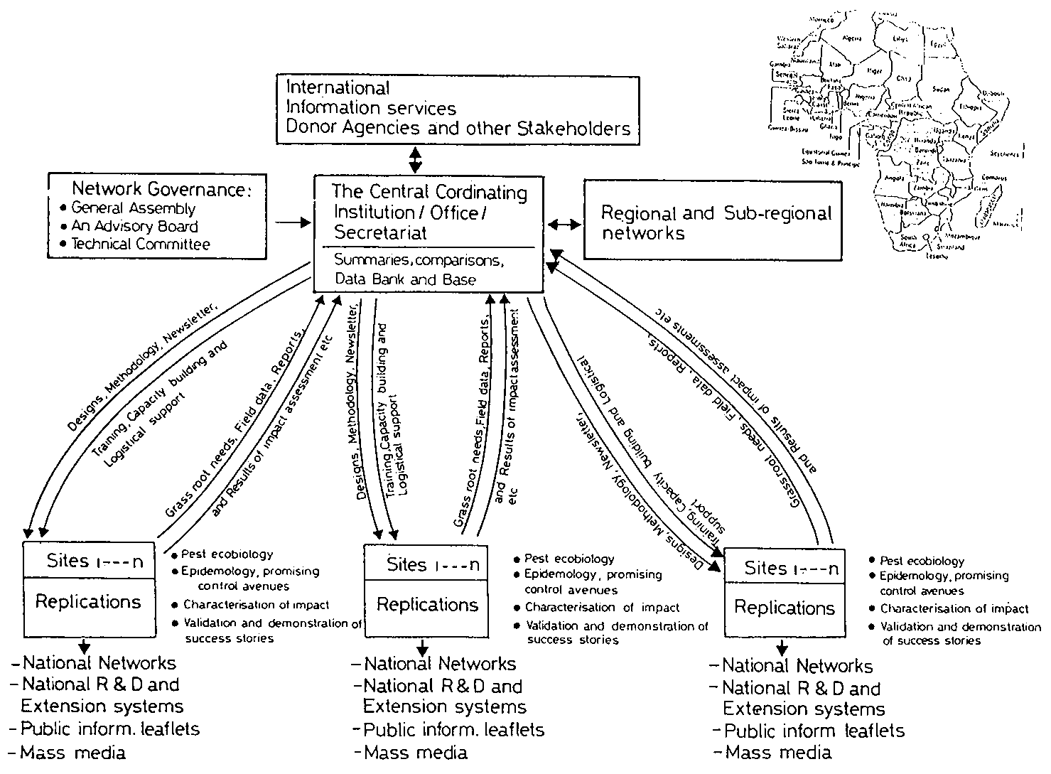 Plucknett and Smith (1984) have recognized seven main principles for success in networking. Burley (1987) has observed that a network must further strive to encourage participants to disseminate the results through formal publications, informal reports, newsletters etc., and promote application of technological findings by users. Odera and Sail (1994) have recently developed a network model for a SSA forestry research network, which can provide a useful frame of reference in the development of an African pest network. The following considerations are particularly important in the development and management of a network: