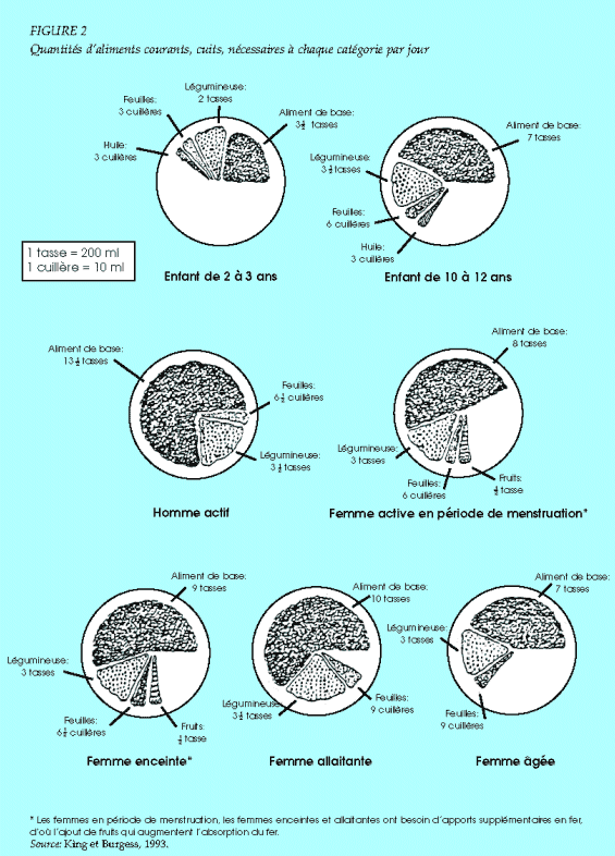 La figure 2 donne une idée générale sur les quantités d'aliments courants, cuits, nécessaires à chaque catégorie par jour.