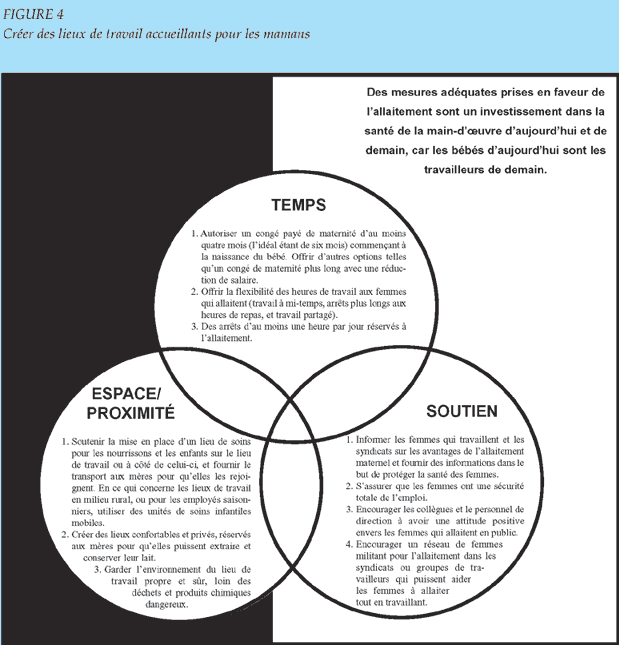 La figure 4, tirée d'un dépliant élaboré par l'Action de l'alliance mondiale pour l'allaitement lors de la Semaine mondiale de l'allaitement de 1993, illustre les investissements nécessaires, en temps, en espace et en soutien, pour que les lieux de travail soient accueillants pour les mamans.