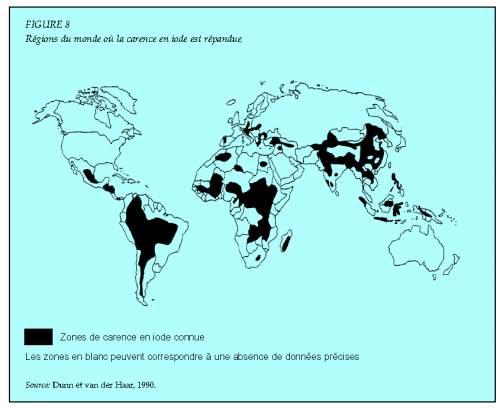 De nombreux pays d'Asie, d'Afrique et d'Amérique latine ont encore un problème important de carence en iode, bien que certains aient fait de grands progrès dans la réduction de la prévalence du goitre. En Chine et en Inde, le goitre endémique est toujours très fréquent. On ne dispose pas de données pour toute l'Afrique, mais on sait que les TCI existent toujours en Ethiopie, au Nigéria, en République-Unie de Tanzanie, au Zaïre, au Zimbabwe et dans d'autres pays plus petits. Dans les Amériques, le goitre endémique a été presque totalement éliminé aux Etats-Unis et au Canada, mais il persiste dans les pays andins comme la Bolivie, la Colombie, l'Equateur et le Pérou, accompagné d'un certain taux de crétinisme. Les TCI existent aussi en Amérique centrale et dans certaines régions du Brésil.
