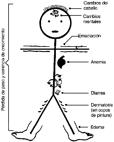Crecimiento deficiente. Siempre hay una carencia en el crecimiento. Si se sabe la edad precisa del niño, se encontrará que es más pequeño de lo normal y, excepto en casos de edema evidente, tendrá menor peso de lo normal (casi siempre de 60 a 80 por ciento del estándar o por debajo de 2 DE). Estos signos se pueden enmascarar por el edema o si se ignora la edad del niño.