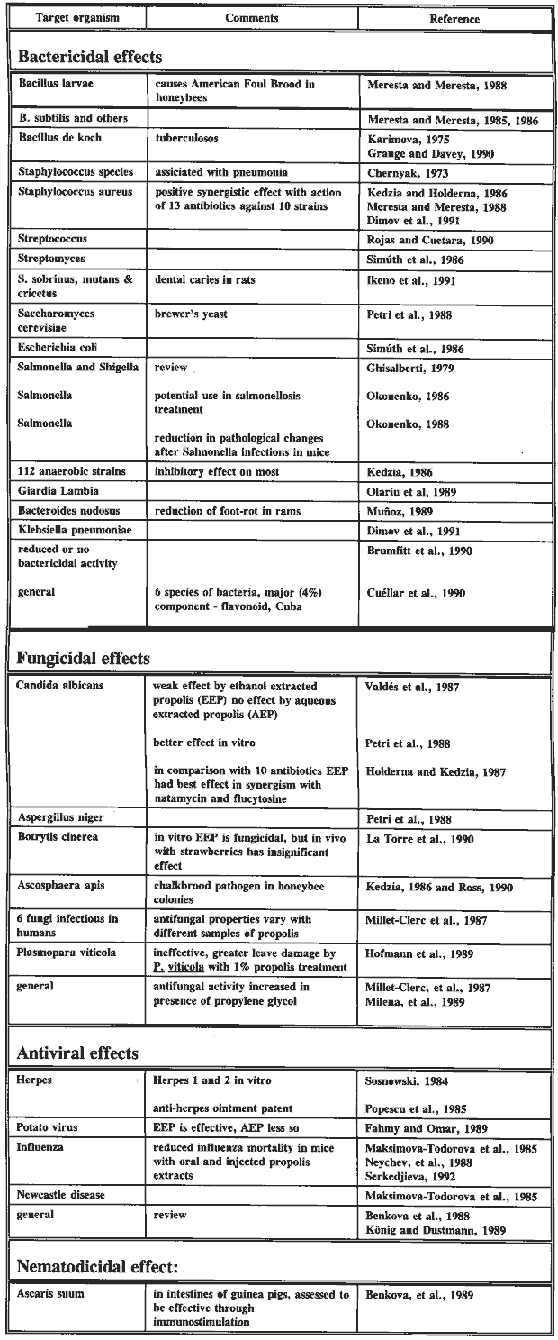 One of the most widely known and extensively tested properties of propolis is its antibacterial activity. Many scientific tests have been conducted with a variety of bacteria, fungi, viruses and other microorganisms. Many of the tests have shown positive control of the organisms by various extracts and concentrations of propolis. A synergistic effect has been reported for propolis extract used together with antibiotics (Chernyak, 1971). Whether propolis exhibits bactericidal or bacteriostatic characteristics often depends on its concentration in the applied extract. Sometimes, propolis extracts are more effective than commercially available drugs (Millet-Clerc, et al., 1987). In all cases, the specific conditions and extracts have to be closely considered. Proven effects of propolis on microorganisms are listed in Table 5.2.