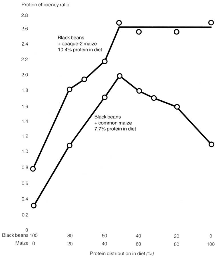 Proteins in plants often contain much smaller amounts of one or more essential amino acids than animal and human proteins. For example, bean protein has less methionine and maize protein has less lysine than egg or human protein. However, if maize and beans are eaten together in the same meal, the mix of amino acids produced for use in the body is improved (see Figure 27). This response has served as a basis for the formulation of high-quality-protein food mixtures containing 70 percent maize and 30 percent common beans.