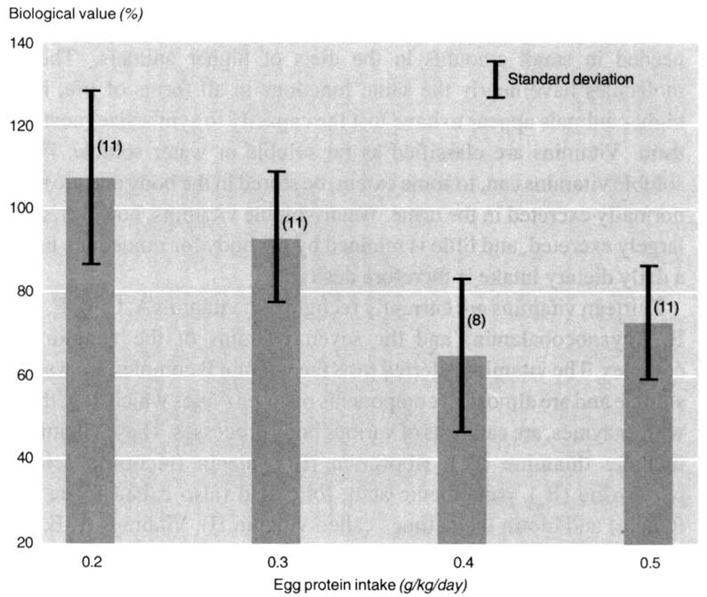 Box 53 - Definition of terms used in evaluating protein quality Amino acid score It the composition of an "ideal" protein - i.e. one containing all the essential amino acids in amounts sufficient to meet requirements without excess - were known, it should then be possible to compute the nutritional quality of a protein or mixture of proteins by calculating the deficit of each essential amino acid below the amount in the "ideal" protein. This approach forms the basis of the so-called amino acid scoring procedure, by which one can evaluate the capacity of a given protein or mixture of proteins to meet the essential amino acid require" meets. An amino acid score can be calculated according to the most limiting amino acid. Limiting amino acid The limiting amino acid is the amino acid in greatest deficit for the age group whose protein requirements are to be met. Only four essential amino acids are likely to limit the protein quality of mixed human diets: lysine, the sulphur-containing amino acids (methionine plus cystine), threonine and tryptophan. Digestibility of protein Large intakes of dietary fibre (e.g. cereal bran) increase the excretion of nitrogen in the faeces, reducing apparent protein digestibility by about 10 percent. Thus the overall composition of the diet must be taken into account when assessing digestibility. Protein efficiency ratio The simplest method for determining nutritive value is to measure the growth rate of young animals fed on test food. The weight gain is then related to the amount of protein eaten. The index obtained is called the protein efficiency ratio (PER). This ratio varies with the level of protein in the diet. The conventional level of 10 percent dietary protein was in general use, but the official standardized level is 9.09 percent protein. Biological value The biological value (BV) of a protein is the proportion of the absorbed nitrogen that is retained for maintenance and/or growth. It is calculated from an analysis of nitrogen intake in the diet and nitrogen output in the urine and faeces. Net protein utilization The net protein utilization (NPU) of a protein is the product of the biological value and the digestibility of a protein, i.e. the proportion of ingested nitrogen that is retained in the body under specified conditions. NPU is a combined measure of digestibility and the efficiency of utilization of the absorbed amino acids. |