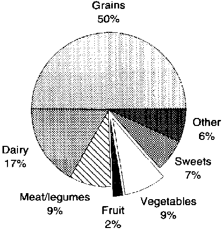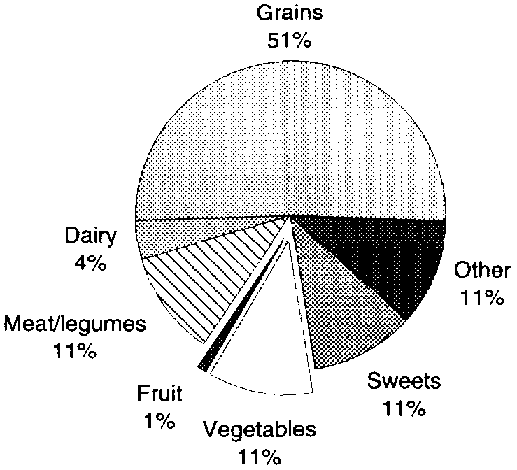 Generalizations are rarely helpful in describing a subject as complex as diets, which depend on many economic, ecological, social and cultural factors and tend to be location and community specific. African diets are usually based on a carbohydrate staple served with soups, relishes and sauces, which may or may not be spicy, prepared from a wide variety of other foodstuffs. Figure 30 shows the proportions of different food groups in the consumption patterns of women and children in Swaziland.