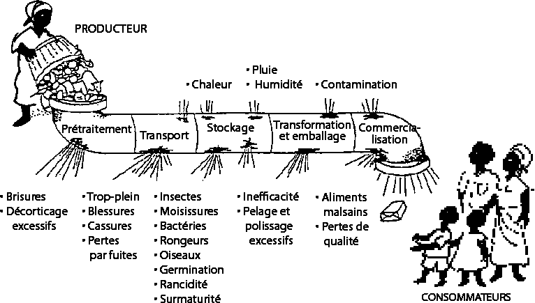 La production alimentaire relève de facteurs tels que les modes dexploitation et dappropriation de la terre, la reproduction et la sélection des espèces végétales, la rotation des cultures, la multiplication, la gestion et lexploitation du bétail. La distribution des aliments comporte une série dactivités après la récolte, dont la transformation, le transport et le stockage, lemballage et la commercialisation des denrées alimentaires, ainsi que des activités relatives aux acquisitions des ménages, aux échanges, aux dons privés et aux distributions publiques daliments. Les activités relatives à lutilisation et à la consommation comprennent la préparation, la transformation et la cuisson des aliments à léchelle du ménage et de la collectivité, ainsi que les processus familiaux de décision concernant les aliments, leur distribution au sein du ménage, les préférences alimentaires dordre culturel ou individuel, laccès aux soins de santé, à lassainissement et aux connaissances.