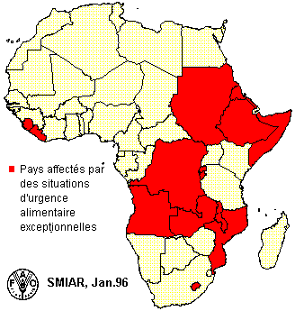 Pays affectés par des situations d'urgence alimentaire exceptionnelles: Angola, Burundi, Erythrée, Ethiopie, Lesotho, Libéria, Malawi, Mozambique, Rwanda, Sierra-Leone, Somalie, Sudan, Zaire et Zambie