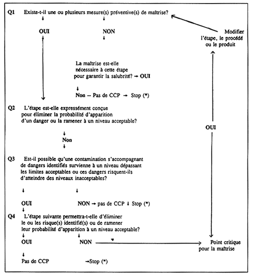 La détermination d'un CCP dans le cadre du système HACCP peut être facilitée par l'application d'un arbre de décision (par exemple, Diagramme 2) qui présente un raisonnement fondé sur la logique. Il faut faire preuve de souplesse dans l'application de l'arbre de décision, selon que l'opération concerne la production, l'abattage, la transformation, l'entreposage, la distribution, etc. Il doit être utilisé à titre indicatif lorsqu'on détermine les CCP. L'arbre de décision donné en exemple ne s'applique pas forcément à toutes les situations. D'autres approches peuvent être utilisées. Il est recommandé de dispenser une formation afin de faciliter l'application de l'arbre de décision.