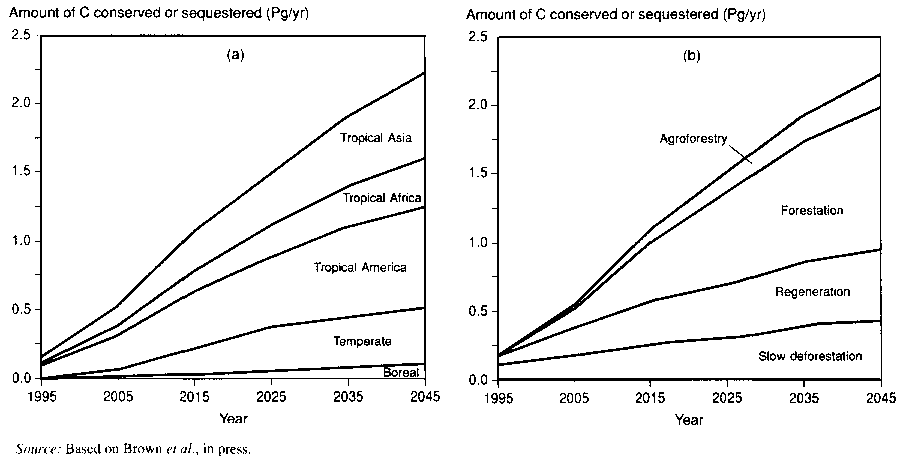 Two recent studies (Nilsson and Schopfhauser, 1995; Trexler and Haugen, 1994) were combined to arrive at a global estimate of the potential amount of carbon that could be conserved and sequestered by different forested regions of the earth between 1995 and 2050. These studies were chosen because they were the only ones that were global in nature, had done an extensive literature review of the land availability issue and included feasible rates of establishment of management options. Both studies assumed aggressive but unspecified policy and financial interventions in the forestry sectors, with no future change in climate that might interfere with the proposed strategies.