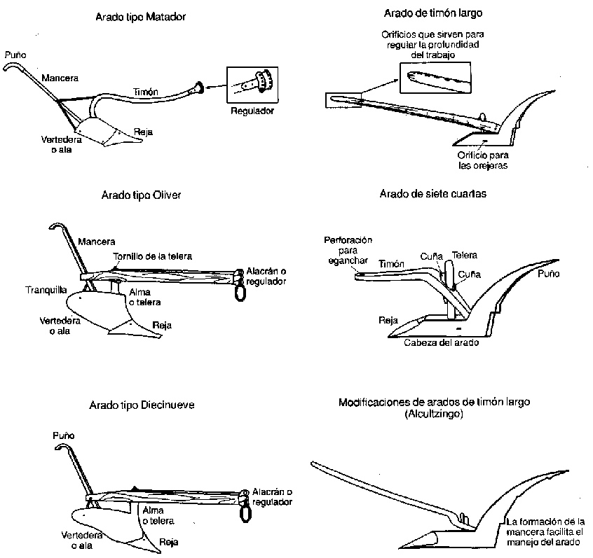 El arado es el instrumento utilizado con mayor frecuencia para las diferentes labores realizadas con animales de tiro. Existe una gran diversidad de arados, y es común agruparlos en simétricos o «de palo», y de vertedera o «de fierro». Los primeros pueden ser radiales o dentales y reproducen los modelos introducidos por los españoles hace 500 años. La preferencia por los tipos de vertedera obedece a una tradición cultural; algunos presentan aspectos técnicos del diseño que responden a las condiciones del suelo y a los requerimientos de los cultivos. Los arados de vertedera son de diversos tipos, según la región donde se utilizan. Algunos son de fabricación nacional y se distribuyen en determinadas zonas; existen modelos que son construidos en pequeños talleres para satisfacer las necesidades locales de poblaciones pequeñas. Entre los tipos más usuales está el Apulco, que se fabrica en cinco tamaños; el Oliver, que se fabrica en tres tamaños, y el Matador. Además de los arados existen rastrillos, rastras, cultivadoras, sembradoras y otros instrumentos de fabricación local.
