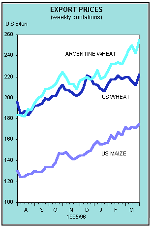 International wheat export prices surged upwards in February due to adverse weather conditions in the major United States winter wheat areas and indications of somewhat tighter export supplies of the 1995 crop than earlier expected. After temporarily weakening in early March, prices rose again late in the month as the outlook for the United States wheat crop deteriorated. By late March, U.S. No. 2 hard winter wheat (f.o.b. Gulf) was quoted at U.S. $ 222 per ton, close to the peak in February and almost 50 percent above the price a year ago. Maize export prices strengthened further during February and March reflecting continuing active export demand and tight stocks, especially in the United States where domestic demand remained strong. By late March, the price of U.S. No.2 maize (delivered Gulf ports) was U.S.$ 175 per ton, some U.S.$ 65 per ton or 60 percent up from a year ago. International rice prices changed little during March after declining somewhat in February. The average price for Thai 100B was slightly lower in March than in the previous month. However, prices of lower grades of rice strengthened slightly, under pressure from generally tight supplies.