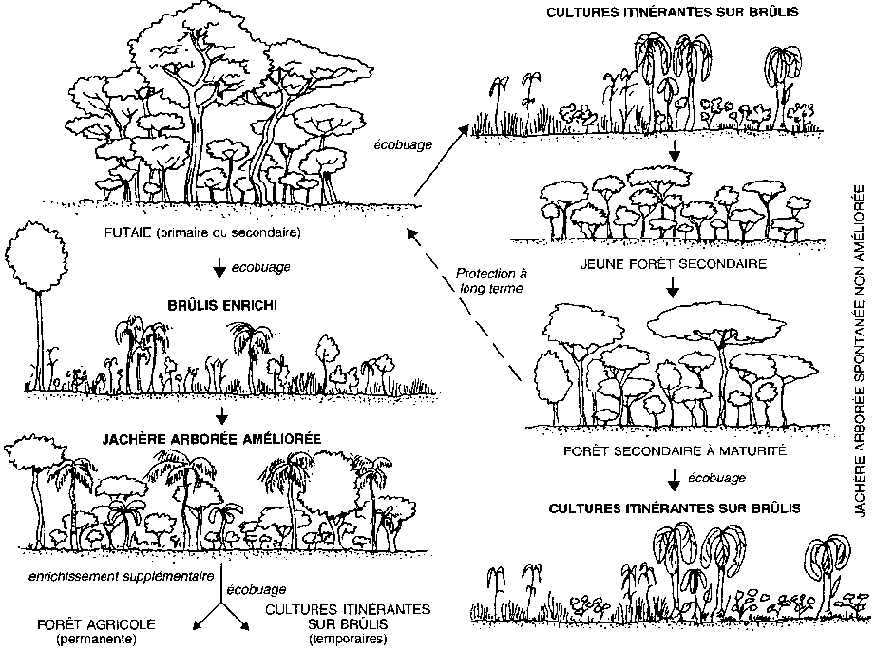 L'adoption de jachères arborées améliorées, à partir de plantations enrichies sélectives d'espèces pérennes sur des brûlis, doit être encouragée dans la mesure du possible dans les zones frontières de l'Amazonie (Dubois, 1988) où les nouveaux habitants ignorent le potentiel productif des jachères améliorées. La figure ci-dessous illustre les différentes étapes des jachères arborées spontanées et améliorées.