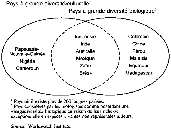 Selon les Nations Unies, la planète compte environ 5 000 ethnies autochtones, soit quelque 300 millions de personnes, vivant dans 70 pays. Pour les anthropologues, le caractère qui définit le mieux une ethnie est l'existence d'une langue parlée spécifique. La figure ci-dessous qui représente le diagramme de Venn (Durning, 1992) fait apparaître, dans le cercle de gauche, les neuf pays possédant la plus grande diversité culturelle (d'après le nombre de langues qui y sont parlées) et, dans le cercle de droite, ceux qui possèdent le plus grand nombre d'espèces uniques. On notera que six des 12 pays caractérisés par une telle «mégadiversité» sont aussi au nombre des pays de grande diversité culturelle (Indonésie, Inde, Australie, Mexique, Zaïre et Brésil).