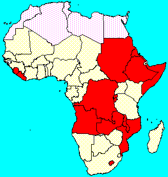 Angola, Burundi, Erythrée, Ethiopie, Lesotho, Libéria, Malawi, Mozambique, Rwanda, Sierra Leone, Somalie, Soudan, Zaïre et Zambie