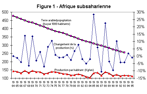 Terres disponibles. L'"excédent de terres" prôné pour le développement agricole en Afrique subsaharienne par les économistes agricoles des années 60 et 70, et par d'autres aujourd'hui encore, est de plus en plus inexistant. D'après ce modèle économique, la production alimentaire doit être accrue grâce à des mesures d'expansion des terres cultivées plutôt que par un effort d'augmentation des rendements par unité agraire. Même si la situation varie d'un pays à l'autre, la figure 1 montre clairement que depuis une trentaine d'années, sous l'effet d'une pression démographique croissante, les terres disponibles par personne baissent rapidement, ce qui signifie que les jachères, périodes où la terre est laissée au repos pour récupérer sa fertilité, ont été raccourcies. Si l'apport d'engrais n'est pas accru (voir ci-dessous), la productivité du sol baisse rapidement. Par ailleurs, les cultures débordent de plus en plus sur les terres marginales et fragiles, où non seulement les rendements sont très faibles mais en outre ils ne sont pas écologiquement viables, et le risque de dégâts irréversibles à l'environnement est très élevé. Il faut de toute urgence intensifier la production agricole de la région, ce qui nécessitera une amélioration des disponibilités en eau, un accroissement substantiel des applications équilibrées d'engrais ainsi qu'une introduction rapide de variétés végétales réagissant aux engrais.