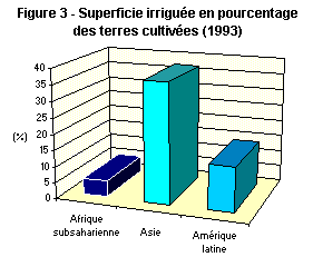 Utilisation de l'irrigation. Malgré des précipitations très variables et trop souvent insuffisantes, et de fréquentes sécheresses, la production vivrière de l'Afrique subsaharienne est presque entièrement pluviale. En 1993, on estime que la proportion de terres irriguées sur les terres cultivées totales était de 5 pour cent en Afrique subsaharienne, 37 pour cent en Asie et 14 pour cent en Amérique latine (figure 3). De plus, 68 pour cent des rares terres irriguées de la région étaient concentrées dans trois pays: Soudan (31 pour cent), Madagascar (17 pour cent) et Afrique du Sud (20 pour cent). Or, le potentiel d'irrigation de l'Afrique subsaharienne est estimé à 33 millions d'hectares environ, dont 16 pour cent seulement sont actuellement exploités.