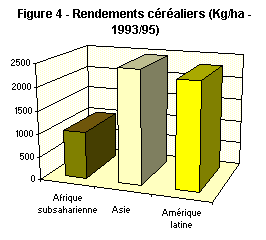 Rendements végétaux. En 1993-95, les rendements céréaliers (y compris le riz en équivalent riz usiné) de l'Afrique subsaharienne étaient équivalents à 41 pour cent de ceux de l'Asie et à 44 pour cent de ceux de l'Amérique latine. Par ailleurs, les essais effectués par des chercheurs sur les champs des agriculteurs de nombreux pays subsahariens font apparaître un écart énorme entre les rendements effectifs et le potentiel réalisable.