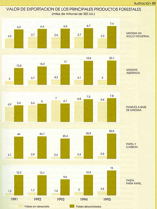 - La producción mundial de madera aserrada en 1995 continuó su prolongado descenso, situándose aproximadamente en 409 millones de m3, es decir, un 20 por ciento menos que en 1990. Este descenso ininterrumpido ha sido resultado en parte de la caída constante de la producción en la ex Unión Soviética y especialmente en la Federación de Rusia. Los grandes productores de Europa y América del Norte han mantenido por lo general la producción del año anterior en lo que se refiere a la madera aserrada de coníferas lo que ha dado lugar a un sobreabastecimiento, grandes volúmenes de existencias y, por consiguiente, presión a la baja sobre los precios en Europa a finales de 1995. Se produjo también un nuevo crecimiento de las exportaciones canadienses de madera aserrada de coníferas, que aumentaron un 4 por ciento, sobre todo con destino a los Estados Unidos. En 1996 se firmó un acuerdo comercial entre el Canadá y los Estados Unidos con el fin de reducir un 10 por ciento -lo que representaría un valor comercial aproximado de 7 000 millones de dólares EE.UU. al año- las exportaciones canadienses de madera aserrada de coníferas con destino a los Estados Unidos.
