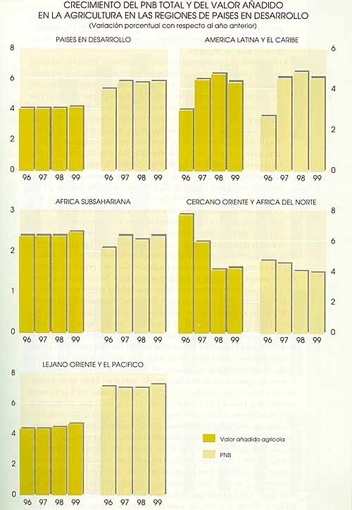 Las otras características principales del actual entorno económico son el alivio parcial de la presión ejercida sobre las tasas de inflación, ya bajas, de los países industriales, y unas subidas de precios considerablemente reducidas en los países en desarrollo. El rápido crecimiento del comercio mundial, debido al progreso conseguido en la liberalización de los mercados y el dinámico comercio entre las regiones de países en desarrollo, particularmente Asia y América Latina y el Caribe, y un descenso general de las tasas de interés en coincidencia con el débil crecimiento y la baja inflación de los grandes países industriales, aunque las tasas de interés se hayan mantenido significativamente más elevadas en Europa que en América del Norte y el Japón. Estos rasgos determinan un entorno global favorable para la producción agrícola, el comercio y la seguridad alimentaria.