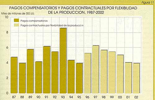 Sustitución de los pagos de compensación por los pagos contractuales desvinculados. La Ley FAIR sustituye el programa de pagos de compensación vigente desde los primeros años setenta por un nuevo programa de pagos desvinculados de siete años de duración. Para recibir esos pagos y poder acogerse a los préstamos concedidos para los productos básicos contractuales, un productor debe suscribir un contrato de flexibilidad de la producción que tendrá validez entre 1996 y el año 2002. En ese contrato se exige que los productores se atengan a las disposiciones vigentes sobre conservación, tierras húmedas y flexibilidad de siembra, así como a continuar dedicando la tierra a usos agrícolas. El total de los gastos acumulados en concepto de pagos contractuales de la Ley FAIR durante los ejercicios económicos de 1996-2002 se ha fijado en una cifra ligeramente superior a 36 000 millones de dólares (Figura 11). El monto de los pagos se asigna entre los distintos productos de acuerdo con porcentajes especificados en la ley (maíz, 46,2 por ciento; trigo, 26,3 por ciento; algodón velloso, 11,6 por ciento; arroz, 8,5 por ciento; otros cereales para pienso, 7,4 por ciento).