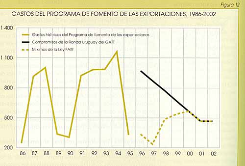 Las principales disposiciones relativas al comercio tienen carácter más específico. Los programas de comercio y de ayuda alimentaria conceden ahora mayor importancia al fomento del mercado, con hincapié en multiplicar las exportaciones de productos de precio elevado y con gran valor añadido. Los gastos del Programa de fomento de las exportaciones (EEP) están sometidos a un límite máximo (Figura 12). Además, el financiamiento total del EEP durante los ejercicios económicos comprendidos entre 1996 y 1999 es más de 1 600 millones de dólares, inferior a los niveles máximos permitidos en virtud del Acuerdo de la Ronda Uruguay. No obstante, durante la campaña agrícola de 1995-96 Estados Unidos utilizó únicamente en forma limitada dicho Programa debido a los elevados precios mundiales, y el gasto fue muy inferior al autorizado en virtud del Acuerdo de la Ronda Uruguay.