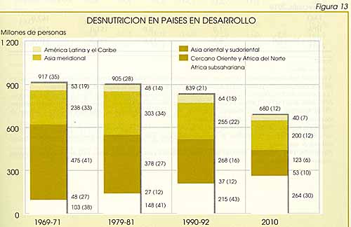 A escala mundial, la seguridad alimentaria para todos presupone un suministro de alimentos suficiente para atender la demanda total de alimentos. Se trata de una condición necesaria, pero en ningún modo suficiente, para el logro de la seguridad alimentaria. En la actualidad, el suministro mundial de alimentos es suficiente, pero no obstante se estima que en 1990/92 unos 839 millones de personas de los países en desarrollo no tenían el debido acceso a los alimentos, porque carecían de capacidad para comprarlos o adquirirlos, es decir, de los medios para ejercer una demanda efectiva. Esta cifra, por muy inaceptable que resulte refleja un considerable progreso desde comienzos de los años setenta: el número ha disminuido en términos absolutos desde unos 917 millones, y en términos relativos desde el 35 por ciento de la población de los países en desarrollo al 21 por ciento, sobre todo como consecuencia del progreso obtenido en Asia oriental (incluida China) y algunas zonas de Asia meridional, como India y Pakistán. Esta situación es especialmente grave en Africa donde el número de personas con desnutrición crónica en los países subsaharianos se ha duplicado con creces durante ese período, según estimaciones de la FAO9. En la Figura 13 pueden verse los cambios pasados y previstos de la desnutrición en los países en desarrollo.
