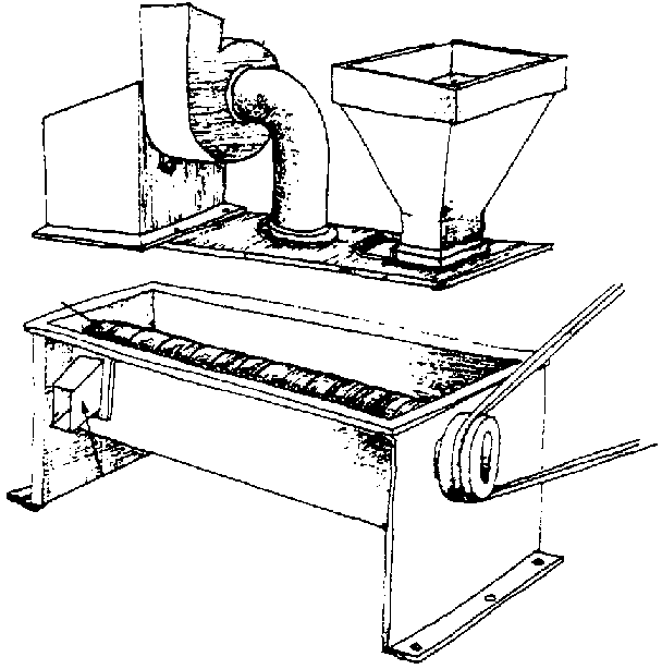 In the case of the huller produced by FAO (Foundries of the Western Workshops), the abrasive surface is a stationary cone. The grain is moved and rubbed on the cone through the action of rotating rubber vanes. The capacity of the machine varies between 200 and 275 kg/in, for a hulling yield of about 78 % and a specific energy consumption of 75-95kJ/kg. The machine includes a system for separating the bran and hulled grain. Unfortunately, this huller which was introduced in Senegal in the 1970s for hulling millet and sorghum is too complex for use in a rural environment. This explains, perhaps, the fact that its use did not spread throughout the country.