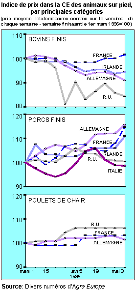 La possibilité d'un lien entre la variante de la MCJ et l'ESB a déclenché une vive réaction chez les consommateurs, avec une chute de la demande pour la viande de boeuf allant jusqu'à 70 pour cent dans les pays membres de la CE, immédiatement après l'annonce. Dans la plupart des cas, la demande s'est tournée vers d'autres catégories de viande. Ces réactions ont entraîné, dans la CE, une chute prononcée des cours de la viande bovine et un renforcement simultané des cours de la viande de volaille et surtout de la viande porcine.