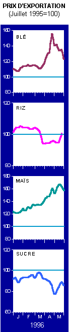 Les stocks céréaliers mondiaux ne se relèveront que légèrement en 1996/97 après le net recul de la précédente campagne, associé à une hausse des prix record. Cependant, au niveau prévu, ils resteraient très inférieurs au seuil minimal nécessaire pour garantir la sécurité alimentaire.
