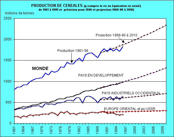 Les projections faites dans l'Etude FAO Agriculture mondiale: Horizon 2010 [ "Agriculture mondiale: Horizon 2010, une Etude FAO" (N. Alexandratos, ed.) publi�e conjointement par J. Wiley and Sons, Royaume-Uni, et la FAO, Rome, 1995 (en fran�ais par Polytechnica, Paris, et en espagnol par Mundi-Prensa Libros, Madrid). Il s'agit d'une version r�vis�e et �largie du document FAO C93/24 pr�par� pour la vingt-septi�me session de la Conf�rence de la FAO (novembre 1993). ] (WAT2010) entreprise en 1992/93 indiquaient qu'en 2010 la production mondiale de céréales (riz donné en équivalent de riz usiné) atteindrait 2 334 millions de tonnes, contre 1 679 millions pendant la période de référence (1988-90). Cela correspond à un taux de croissance de 1,6 pour cent par an, chiffre nettement inférieur à celui des trois décennies précédentes (2,6 pour cent par an au cours de la période 1961-1990) et seulement modestement supérieur au taux annuel moyen révisé de croissance de la population mondiale pour la période 1990-2010, qui devrait être de 1,45 pour cent selon les prévisions de l'ONU. L'Etude prévoyait de nouveaux accroissements de la production de céréales par habitant dans les pays en développement, avec toutefois une décélération de la progression en ce qui concerne la production mondiale de céréales. L'une de ses principales conclusions était que, dans de nombreux pays, les niveaux de consommation resteraient totalement insuffisants pour permettre une bonne nutrition et que la sous-alimentation resterait largement répandue à moins que des mesures extraordinaires ne soient prises pour assurer que tous aient à manger. De fait, la conclusion finale de l'Etude, à savoir qu'en l'an 2010 il y aurait encore 640 millions de personnes sous-alimentées, a été une des grandes raisons pour lesquelles la FAO a convoqué, au niveau des Chefs d'Etat et de gouvernement, un Sommet mondial de l'alimentation qu'il est maintenant prévu de tenir du 13 au 17 novembre 1996.