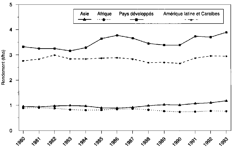 Environ 90 pour-cent des superficies cultivées en sorgho dans le monde et 70 pour-cent de la production mondiale se trouvent dans les pays en développement. (Figs. 1 et 2). L'Asie et l'Afrique produisent chacune de 25 à 30 pour-cent de la production mondiale (Tableau 1). Le sorgho est surtout cultivé par des ménages paysans pratiquant une agriculture à petite échelle. En Afrique, la production se caractérise par une culture extensive, à faible apport d'intrants et peu productive. La production est généralement plus intensive en Asie; les engrais et les semences améliorées y sont beaucoup plus utilisés. Sur ces deux continents, le sorgho est d'abord utilisé en alimentation humaine. Par contre, dans les pays développés, la presque totalité de la production est destinée à l'alimentation animale.