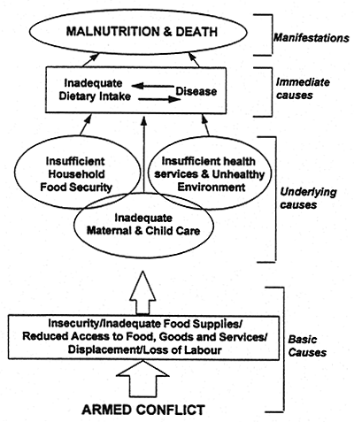 Malnutrition and death among children and their families within armed conflict situations can be directly traced back to inadequate dietary intake and disease. There is a strong link between severe malnutrition and child mortality, but in famine and armed conflict not only the severely malnourished die, the majority of children who die are not severely malnourished (Young & Jaspers, 1995). Death often occurs because of a health crisis when populations are displaced and are exposed to an unhealthy environment, often with overcrowding and a subsequent increase in infectious diseases such as diarrhoea and measles.