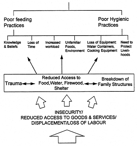 Armed conflict seriously constrain the care system in the household and the community. Families seek the best way to cope and often tend to emphasize protection of livelihoods. This may have negative implications for child care and welfare. With income diversification and longer searches for water, food, and work, the amount of time devoted to children will decrease. Distress and destitution activities may include migration by entire family units, members of families, prostitution by both women and the female children and, in extreme cases, selling off and abandonment of children (Longhurst & Tomkins, 1995 and Human Rights Watch/Africa, 1995). Care interventions are not only a family matter, actions taken by governments and other bodies at international, national and regional levels can affect care in the household and the nutritional status of family members including children.