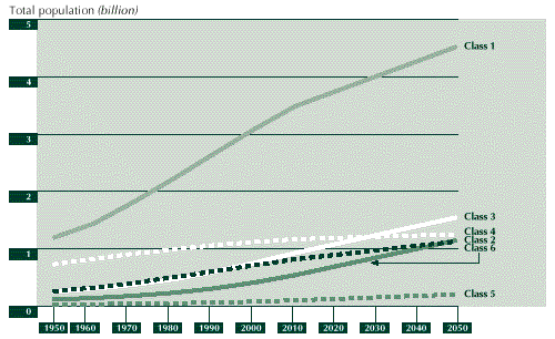 Figure 6 TOTAL POPULATION OBSERVED FROM 1950 TO 1990 AND PROJECTED FROM 1995 TO 2050, BY CLASS OF DIET (medium variant) ![]() |