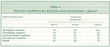 2.11 Although there has been a global increase in the availability of energy, protein and fat, the availability of the last two has not risen in the least-developed countries (Tables 3 to 5). This indicates some global improvement in the availability of food, but not necessarily in food consumption among the poor. At least the proportion of people with inadequate food-energy consumption has declined in all regions except sub-Saharan Africa (Table 1).